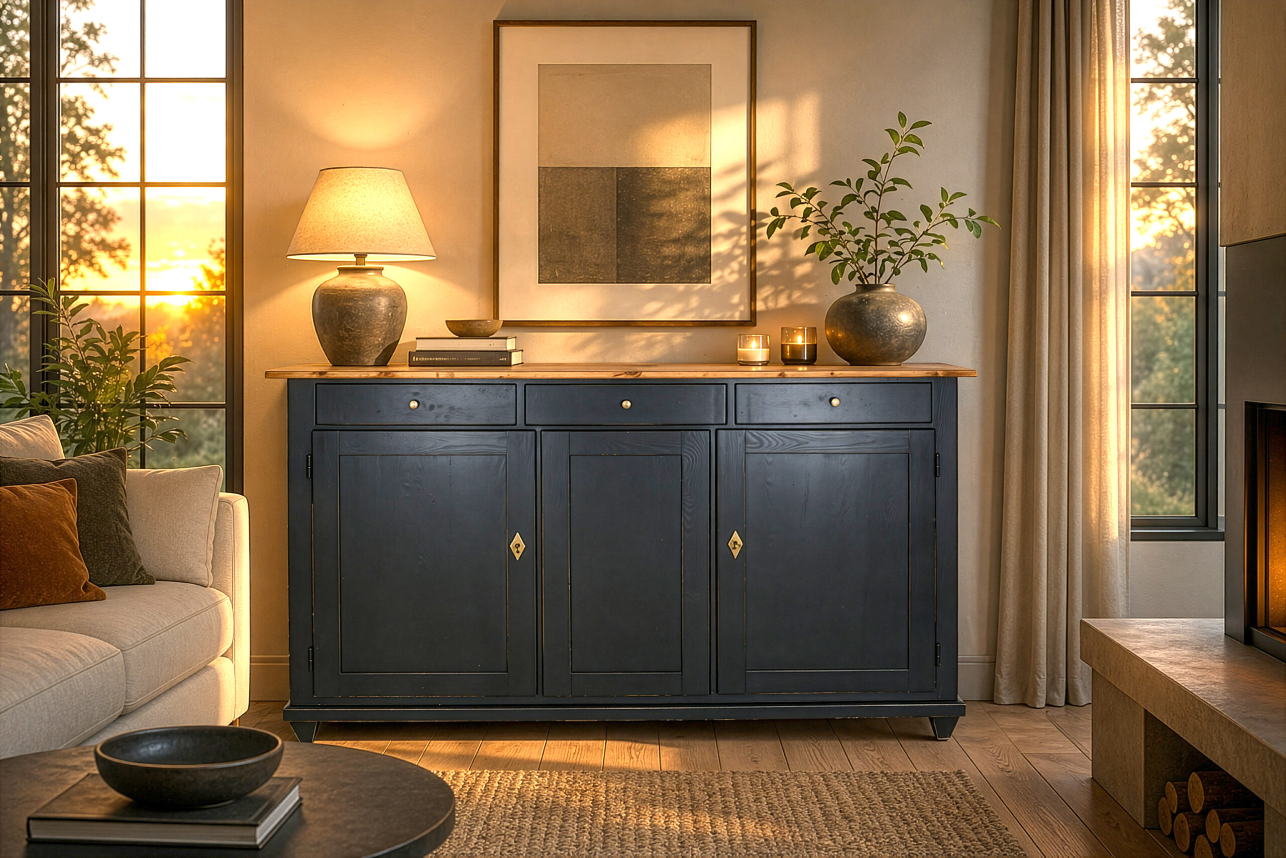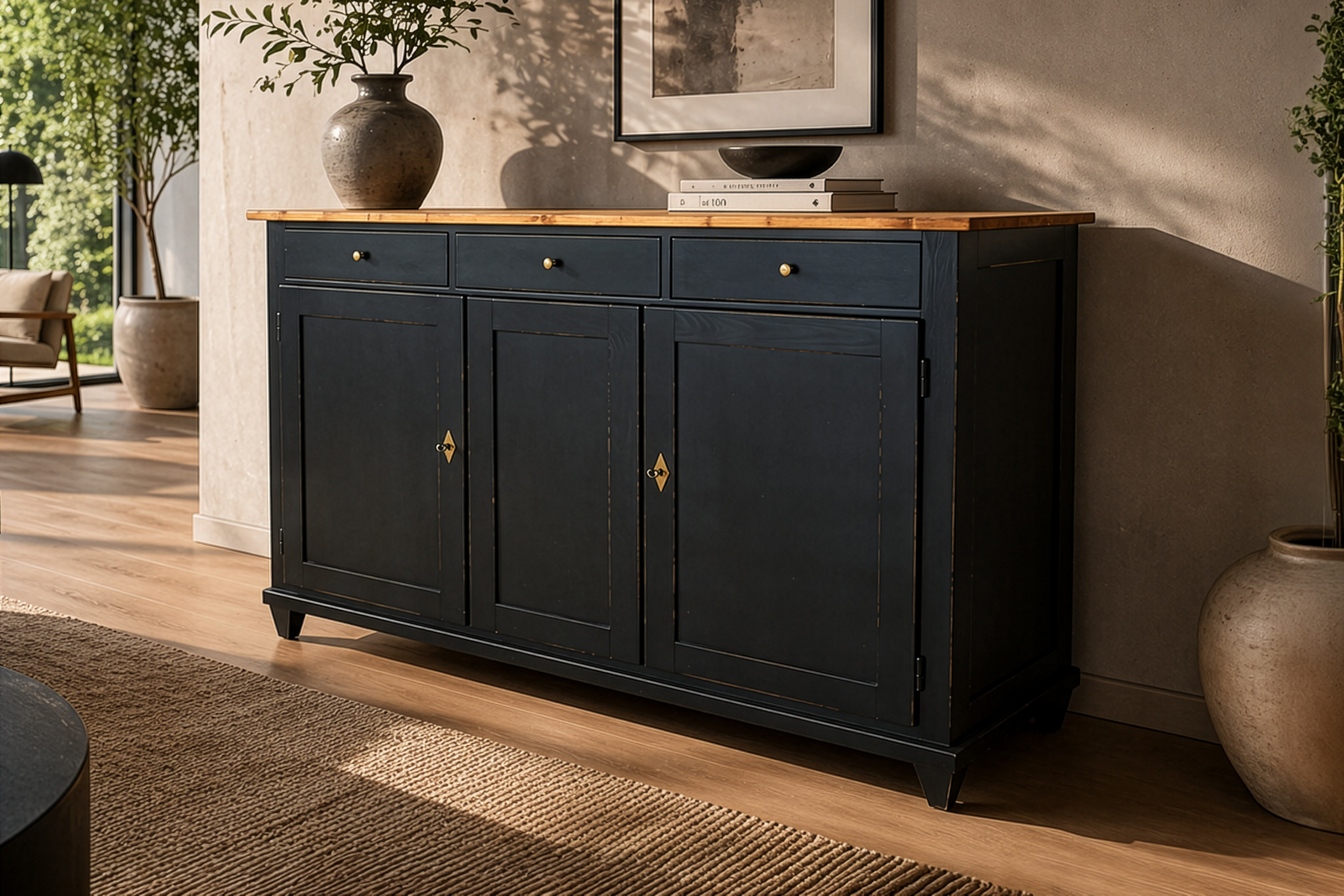 In modernen Interieurs entfaltet dieses Möbel seine stärkste Wirkung. Es bringt Ruhe in offene Räume, Struktur in klare Architektur und Wärme in minimalistische Umgebungen. Die Kombination aus dunkler Oberfläche und natürlichem Holz wirkt dabei nicht dekorativ, sondern selbstverständlich – wie ein bewusst gesetzter, aber leiser Akzent auf höchstem Niveau.