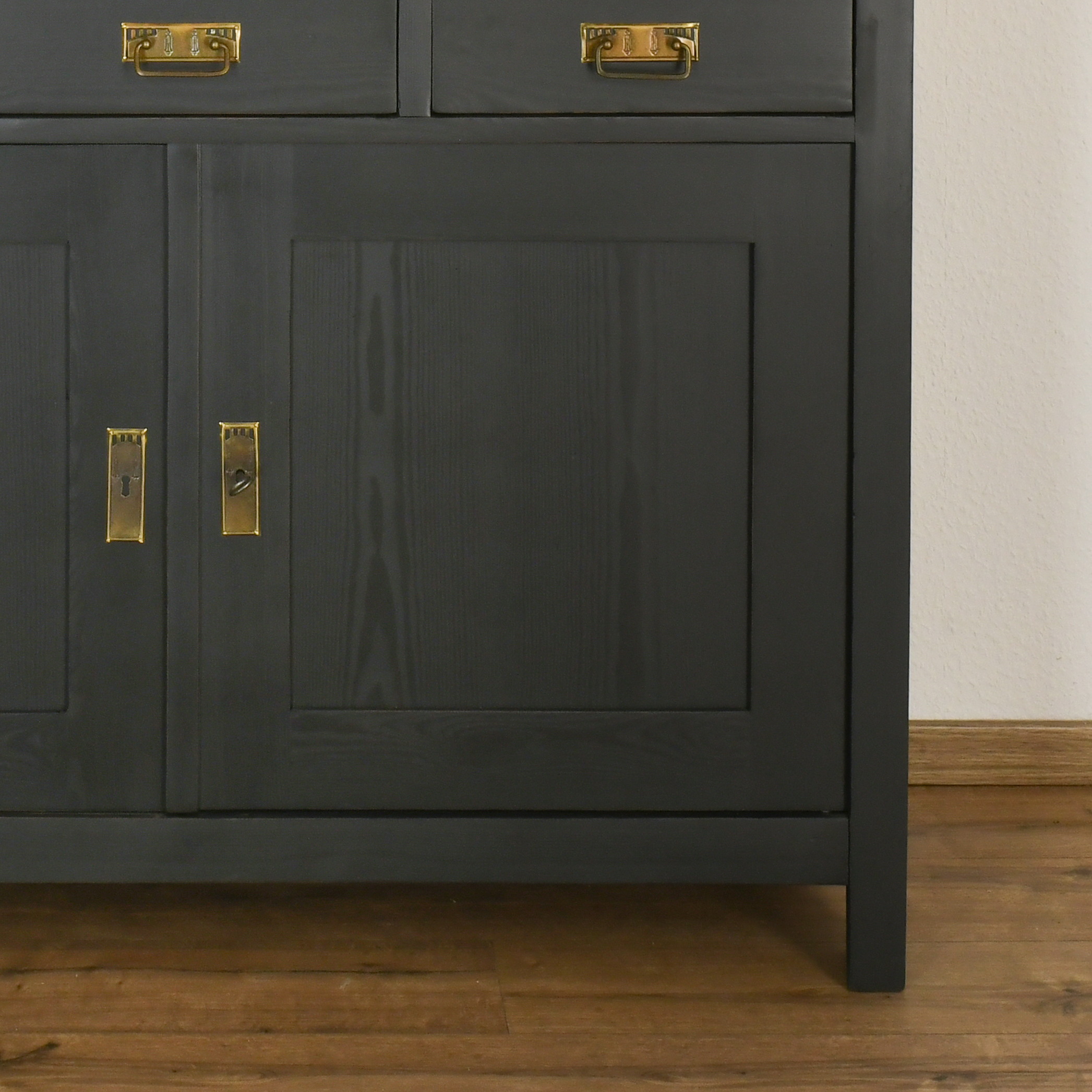 Erleben Sie die Eleganz des Art Déco mit diesem stilvollen Buffet, gefertigt um 1920 aus massivem Kiefernholz. Die Oberfläche wurde in einem edlen Shabby Chic-Look mit RAL 7021 Schwarzgrau matt gestaltet, wodurch das Buffet eine moderne und zugleich charmante Vintage-Optik erhält. Es wurde professionell restauriert und befindet sich in hervorragendem Zustand – bereit, Ihr Zuhause zu bereichern.
