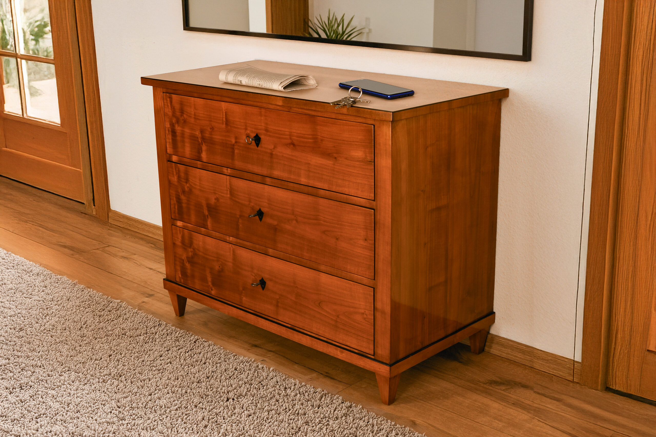 Mit ihrer klaren Formensprache und der hochwertigen Holzqualität lässt sich die Kommode ausgezeichnet in moderne Wohnräume integrieren. Ob als edles Stauraummöbel im Schlafzimmer, im Flur oder als eleganter Blickfang im Wohnbereich – dieses Stück verbindet historische Substanz mit zeitloser Ästhetik.