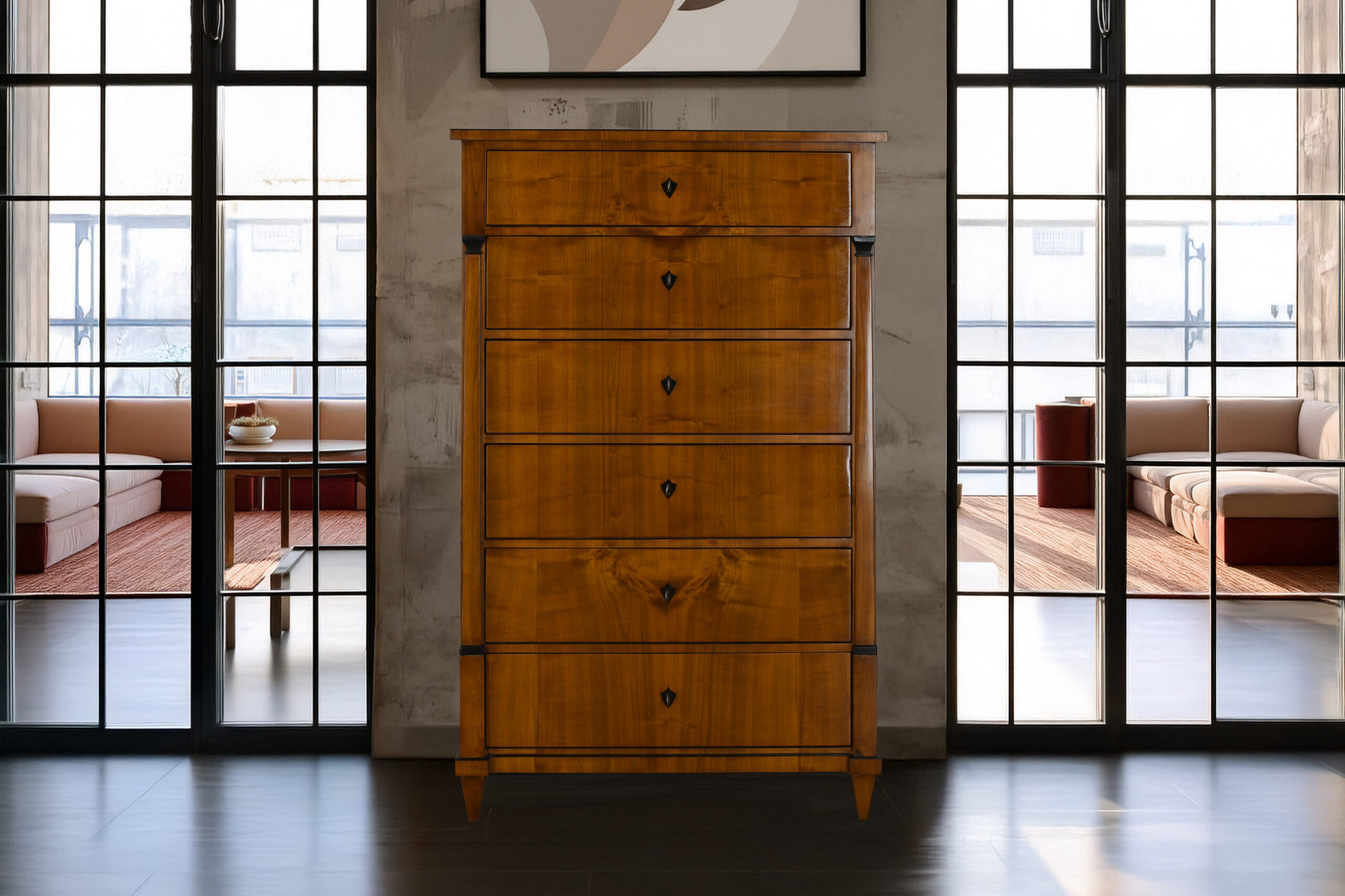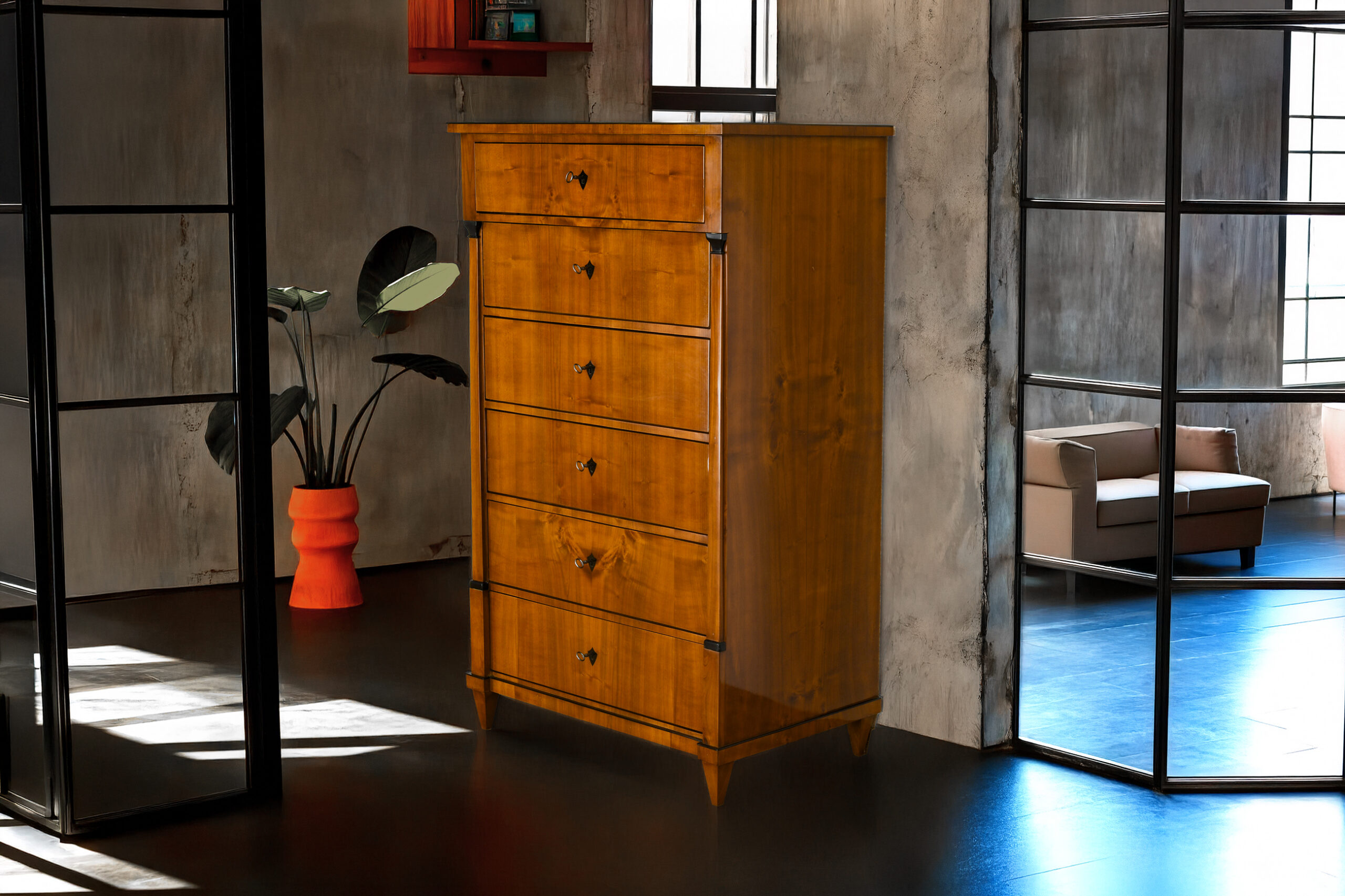 Ob im Wohn- oder Schlafzimmer, im Ankleidezimmer oder als stilvolles Highlight im Büro – diese Kommode fügt sich mühelos in moderne Interieurs ein. Sie verbindet den klassischen Biedermeier-Stil mit zeitloser Eleganz und kann als praktisches Ordnungsmöbel ebenso überzeugen wie als dekorativer Blickfang. Ihr warmes Kirschbaumholz und die feinen ebonisierten Details setzen in jedem Raum Akzente, ohne aufdringlich zu wirken.