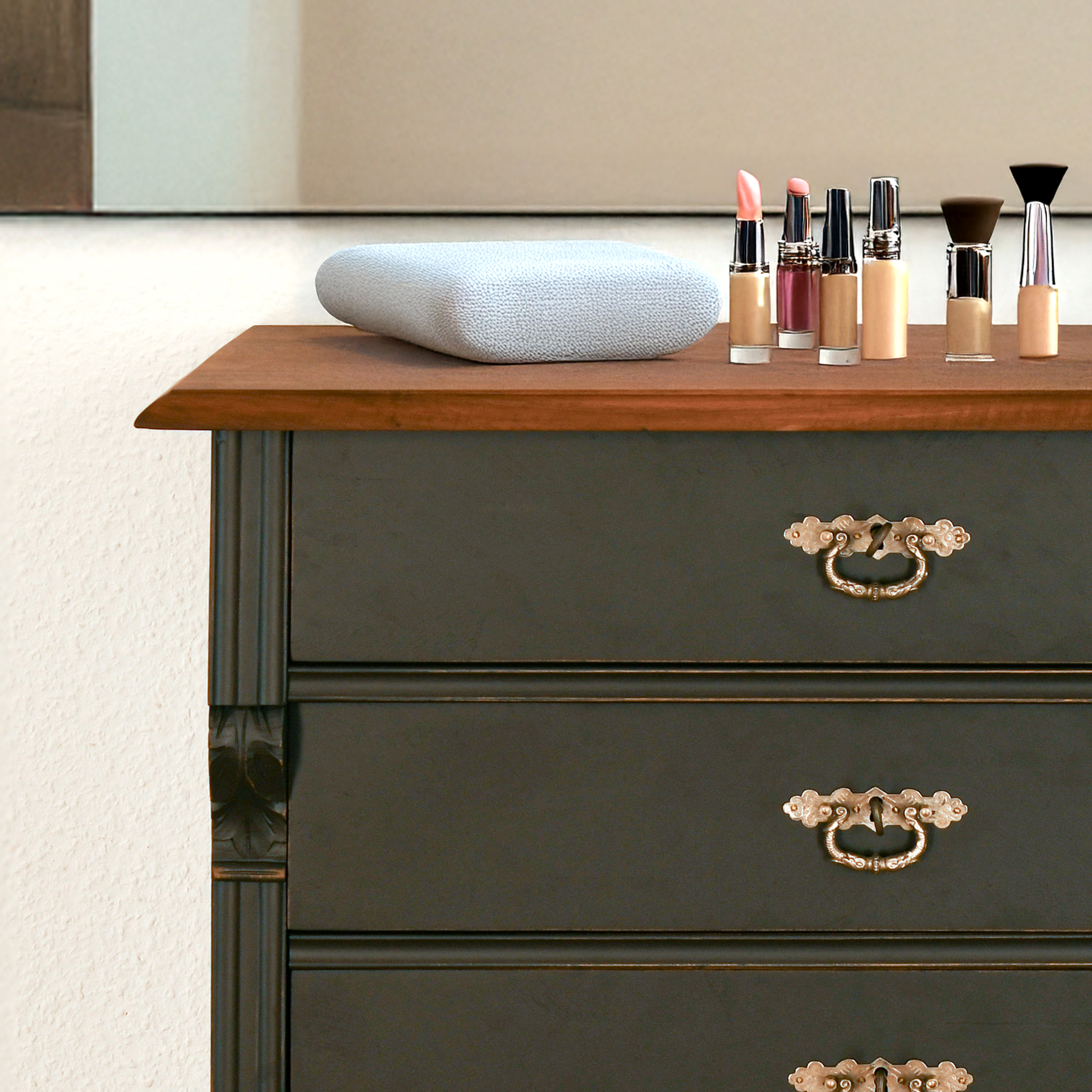 Diese elegante Gründerzeit-Kommode wurde um 1880 aus massiver Kiefer gefertigt und besticht durch ihr schmales, platzsparendes Design. Die Oberfläche ist im Shabby Chic Stil in RAL 7021 Schwarzgrau tiefmatt lackiert, während die Platte in einem warmen Naturholzfarbton gehalten ist. Originale Beschläge runden das klassische Erscheinungsbild ab.