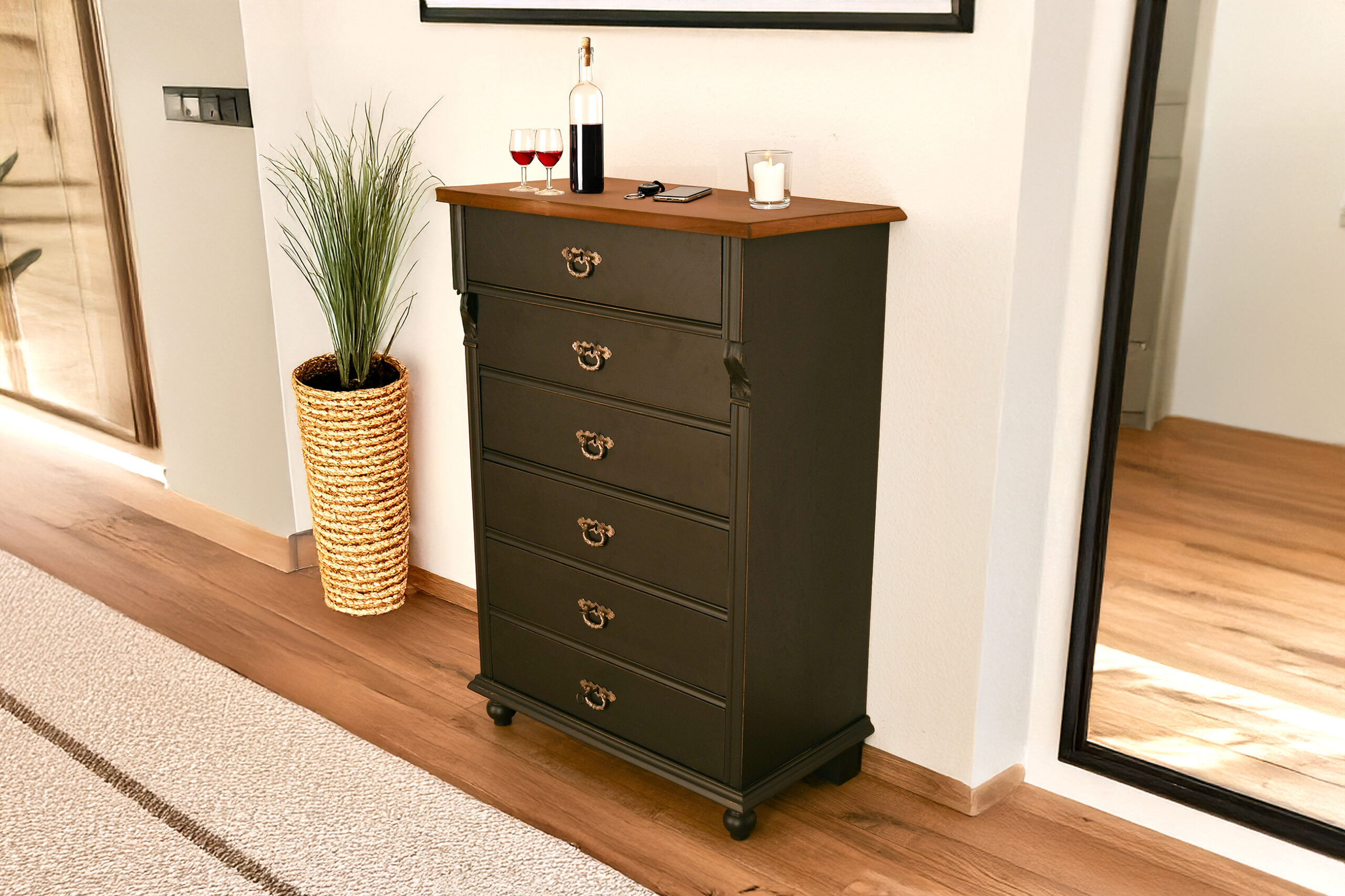 Die sechs übereinanderliegenden Schubladen bieten viel Stauraum für Kleidung, Wäsche, Dokumente oder Alltagsgegenstände, ohne dass die Kommode dabei wuchtig wirkt.