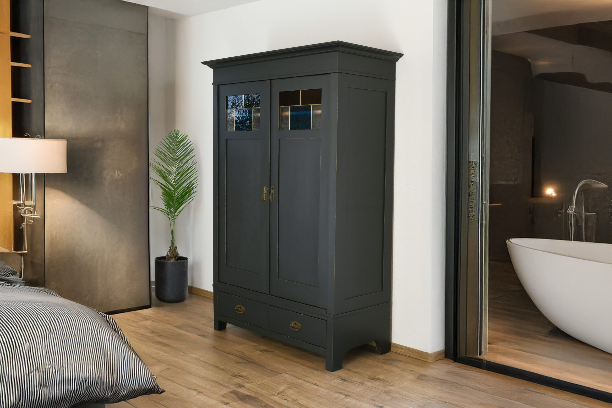- Shabby Chic in Schwarzgrau (RAL 7021): Die Oberfläche präsentiert sich im angesagten Shabby-Chic-Stil, verleiht dem Schrank einen charmanten Vintage-Look und integriert sich harmonisch in moderne Wohnwelten.