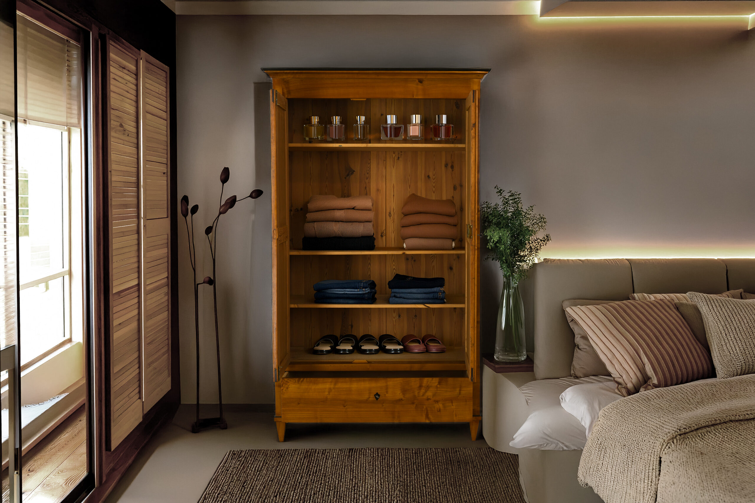Trotz seines Alters fügt sich dieser antike Schrank hervorragend in moderne Interieurs ein. Gerade die klare Linienführung und die zurückhaltenden, edlen Details machen ihn zu einem Möbelstück, das sowohl in klassischen als auch in zeitgenössischen Wohnkonzepten souverän wirkt. Ob im Schlafzimmer, im Ankleidezimmer, im Arbeitsbereich oder als stilvoller Stauraum im Wohnraum – dieser Schrank setzt einen ruhigen, wertigen Akzent, ohne dominant zu wirken.