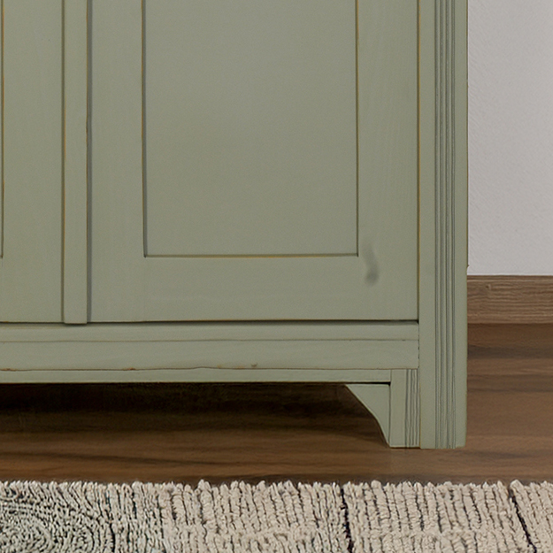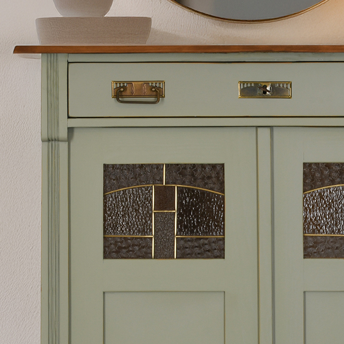 Dieses charmante Vertiko im Art Déco-Stil, gefertigt um 1920, besticht durch seine elegante Farbgebung in RAL 130 60 10 Salbeimattgrün, tiefmatt lackiert und den trendigen Shabby-Chic-Look. Ein besonderes Highlight ist die originale, kunstvolle Verglasung der Türen mit verschiedenen Ornamentglasscheiben und feinen Messingstegen, die dem Möbelstück einen unverwechselbaren Charakter verleihen. Die Deckplatte zeigt sich in einem warmen Naturholzfarbton und sorgt für eine harmonische Kombination aus Farbe und Holzstruktur.