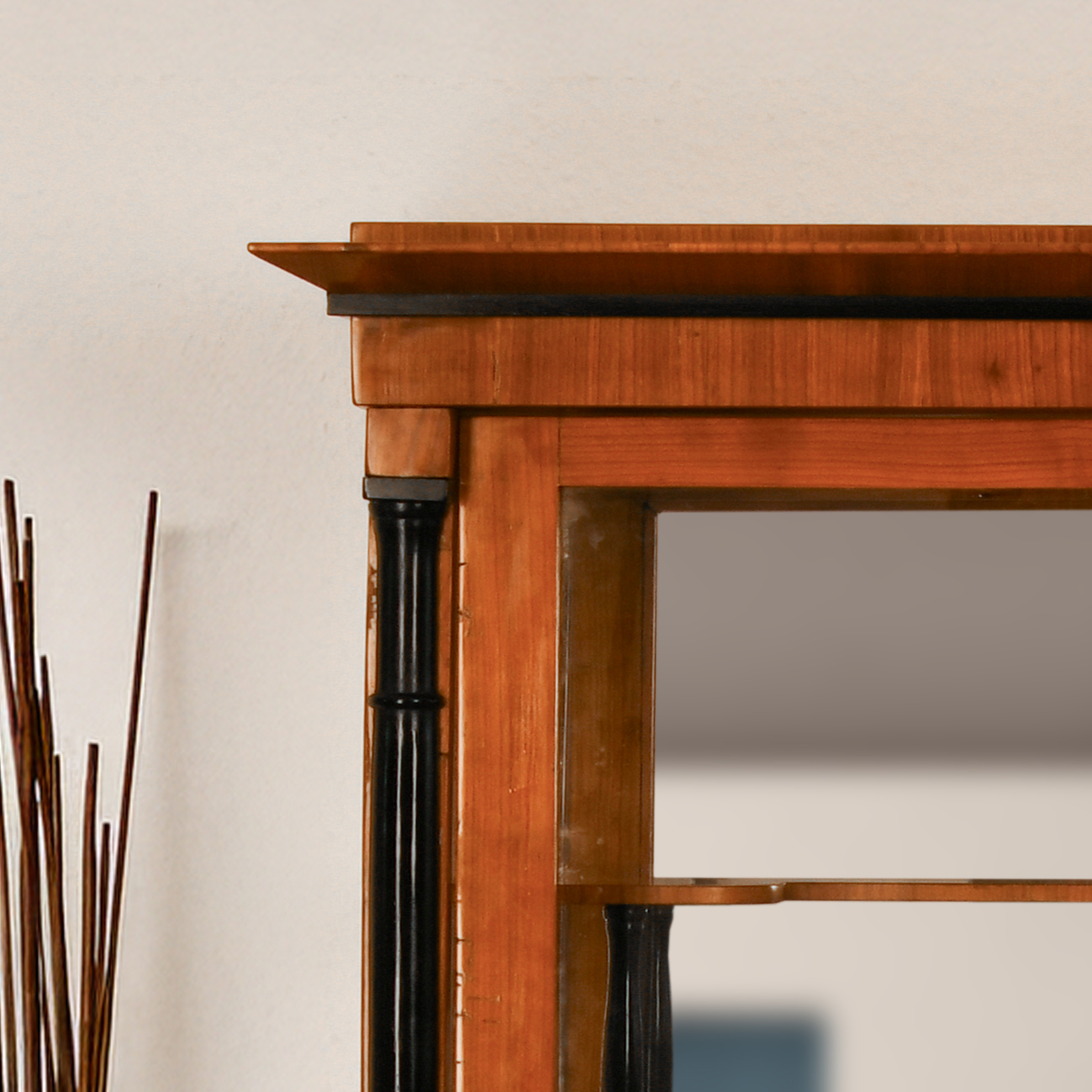 Diese elegante, um 1840 gefertigte Biedermeier-Vitrine überzeugt durch ihre harmonischen Proportionen und den edlen Materialkontrast von warmem Kirschbaumfurnier auf Nadelholz und ebonisierten Details. Das klassisch klare Erscheinungsbild wird durch konische Spitzfüße und die flankierenden ebonisierten Halbsäulen unterstrichen, die dem Möbel eine aufrechte, fast architektonische Wirkung verleihen.
