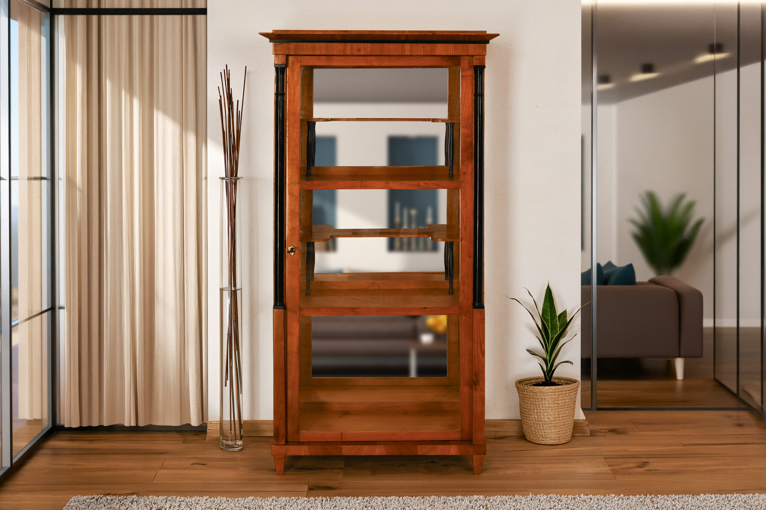 Eine authentische Biedermeier-Vitrine von 1840, die meisterhaft restauriert und sofort einsatzbereit ist. Ein Stück klassischer Handwerkskunst, das antike Eleganz mit moderner Wohnästhetik verbindet.